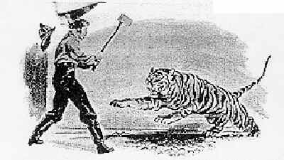 July 13,1865 a fire was discovered at the Barnum Museum on Anne St. in New York City. During the excitement, a huge Bengal tiger broke loose of his cage and leaped from the second - story window to the street. Spectators stampeded in terror, others froze helplessly in their tracks. Several police officers banged away ineffectively with their small pistols.